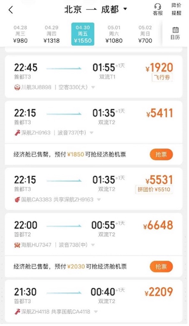 (图说:4月30日出发的京蓉航线,多个晚上出发的航班只有商务舱)
