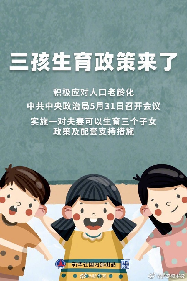 2021年5月31日,中共中央政治局召开会议,决定进一步优化生育政策,实施一对夫妻可以生育三个子女政策及配套支持措施。