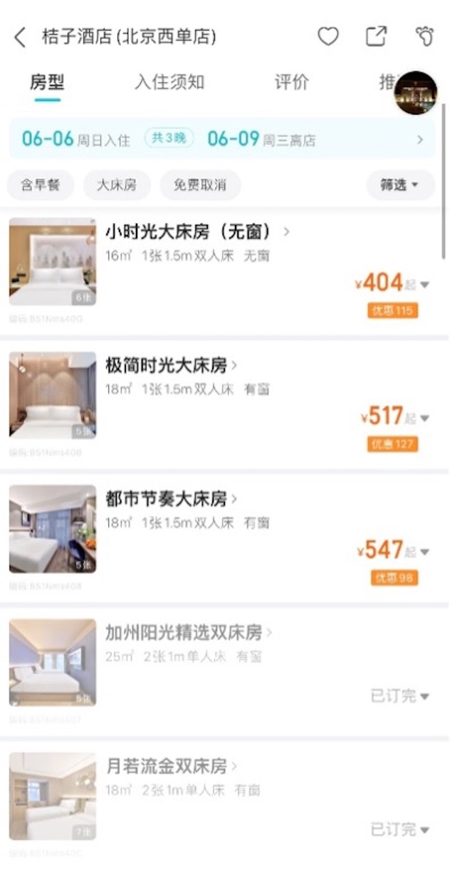 (图说:5月27日16时,在去哪儿平台搜索发现,6月6至9日入住的、北京师范大学附属中学附近的一家酒店部分房型已经无房)