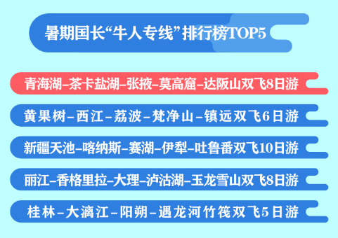 去年以来,消费者对于出游品质的关注度呈现出非常明显的上升趋势,安心游、安心住成为“标配”。途牛自营产品品牌高品质跟团游“牛人专线”成为用户国内长线跟团的热门选择,暑假团期国内长线“牛人专线”热门TOP5分别为“青海湖-茶卡盐湖-塔尔寺-张掖丹霞-敦煌莫高窟-门源-达阪山双飞8日游”“贵州黄果树-西江-荔波-梵净山-镇远双飞6日游”“新疆天池-喀纳斯-禾木-五彩滩-赛湖-伊犁-巴音布鲁克-那拉提-吐鲁番双飞10日游”“丽江-香格里拉-大理-泸沽湖-玉龙雪山双飞8日游”“桂林-大漓江-阳朔-遇龙河竹筏双飞5日游”。