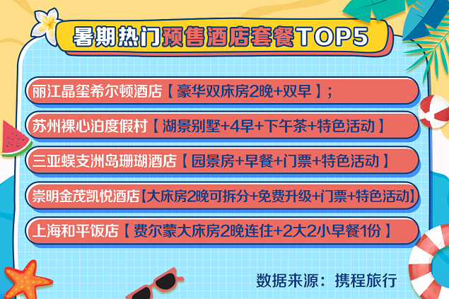 暑期度假 “吃”、“住”场景不分家。携程数据显示,今年暑假,“酒店+美食”的常规套餐销量较2020年同期增长超15倍,客单均价近1700元。除常规酒店套餐外,携程直播间内的预售酒店套餐也备受欢迎。针对暑期旅游旺季,携程也专门为用户准备了旅行红包,7折起预订品质住宿,玩转整个暑期。