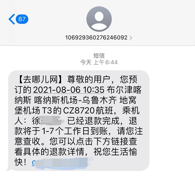 原本计划去新疆旅行的徐女士因为疫情终止出游计划,而她购买的布尔津喀纳斯-乌鲁木齐的机票还没有进行退款。8月3日晚间,看到民航局发布通知后,徐女士决定吸取去年的经验,早上再致电平台申请退票。4日一早,徐女士就打开去哪儿旅行APP进行退票。让她惊讶的是,订单页面已经有退票政策提示,不需要致电客服也可以自助办理。