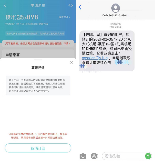 与此同时,针对尚未发布政策的机票,去哪儿平台上线了订阅功能。消费者提交退款时平台会弹窗提示尚不能免费退款,一旦订阅,实时为其推送政策更新情况,一旦航司发布相应政策,去哪儿会即时短信通知,协助用户进行退改。