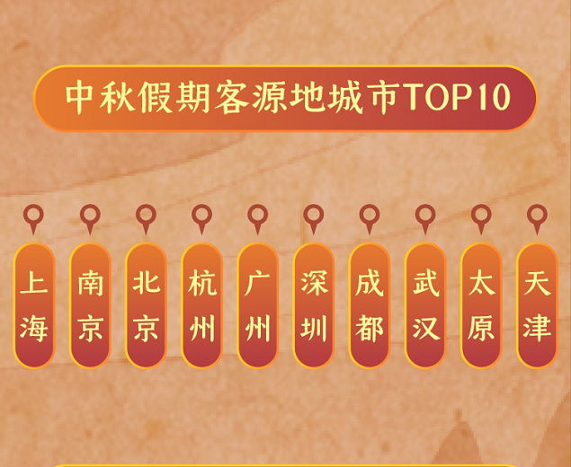 从客源地分布整体情况来看,这个中秋假期,上海的消费者出游热情最高,位居中秋客源地城市榜单榜首,紧随其后的分别是南京、北京、杭州、广州、深圳、成都、武汉、太原和天津。同时,珠海、苏州、哈尔滨、西安、沈阳等城市出游人次保持着较快增长,旅游消费能力和消费规模不容小觑。