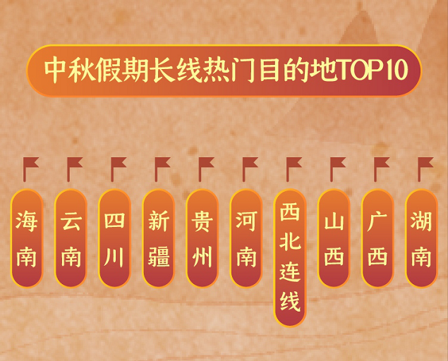和往年暑期长线热而中秋更聚焦短线不同的是,今年中秋假期,早早开启了国庆黄金周国内长线游的前奏。途牛旅游网数据显示,海南、云南、四川、新疆、贵州、河南、西北连线、山西、广西、湖南上榜国内长线热门目的地TOP10;中秋出游行程天数为4-6天、6天以上的预订出游人次占比分别为40%、24%。可以预见,国内长线游市场或将在“十一”黄金周迎来新一轮预订和出游高峰。