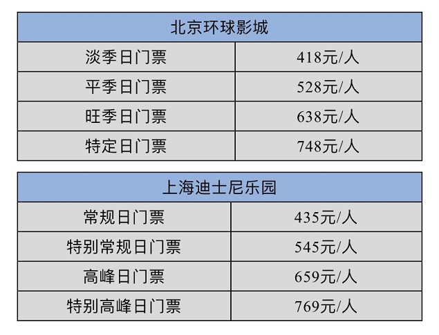 (北京环球影城、上海迪士尼乐园现行门票价格如上表所示)