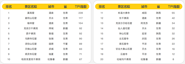 在丝路石窟景点中,TPI指数最高的敦煌莫高窟以其神秘东方文化,长期高居丝路石窟热度之首,精美壁画闻名于世的莫高窟被新生代旅行者视为文化潮流的胜地。除了参观莫高窟神佛像,年轻人还热衷于“化身”同款壁画飞天,在沙漠日落下起舞,通过马蜂窝等社交网络分享“大片”,为敦煌亲身代言,《又见敦煌》大型演出更是登临演艺TPI指数榜榜首。