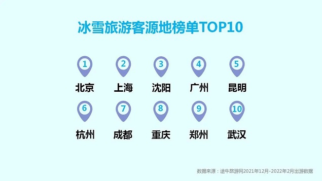 随着全民冰雪旅游热情持续升温,2021-2022冰雪季期间,北京、上海、沈阳、广州、昆明、杭州、成都、重庆、郑州、武汉成为冰雪旅游热情最盛的客源地TOP10,其中,南方城市占据榜单7席。