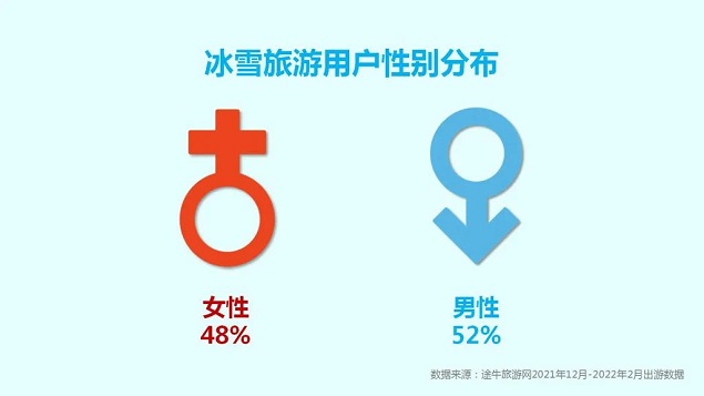 从性别比例上看,男性游客预订冰雪旅游产品的积极性略胜一筹。与此同时,和往年同期出游数据相比,女性游客对冰雪旅游的热情也在逐年攀升。
