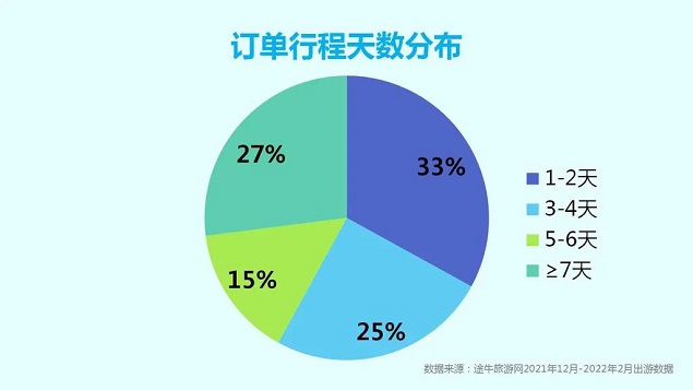 在出游行程时间跨度上,冰雪旅游消费呈现更加多样化的趋势,其中,行程天数在1-2天的订单占比最高,7天及以上的行程订单占比次之,短途轻旅游、长线度假成为了两大热门出游姿态。