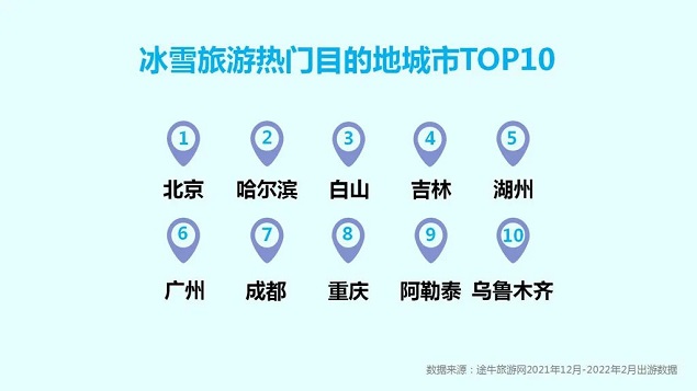 具体到热门城市,“双奥之城”北京既是出游热情最高涨的客源地,也是热门目的地榜单的“领头羊”。在常态化疫情防控形势下,冰雪旅游本地化、周边化趋势显著,尤以3小时左右车程的“家门口”的冰雪景区备受消费者青睐。