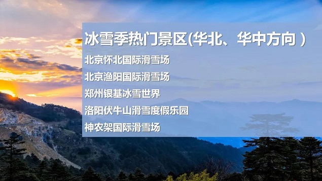 华北方向,北京怀北国际滑雪场、北京渔阳国际滑雪场以及郑州银基冰雪世界、洛阳伏牛山滑雪度假乐园等综合性娱雪场馆和景区成为周边游客的热门选择。
