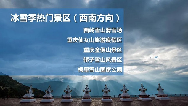 西南方向,西岭雪山滑雪场和山脚的温泉吸引着游客的脚步,途牛私家团线路“成都-西岭雪山-花水湾双飞5日游”、自由行线路“西岭雪山+安仁古镇2日1晚游”等成为2022年春节热卖产品;重庆仙女山、金佛山在雪季同样迎来滑雪热潮。此外,云南轿子雪山、梅里雪山凭借壮观迷人的冰雪景观也吸引了众多游客。