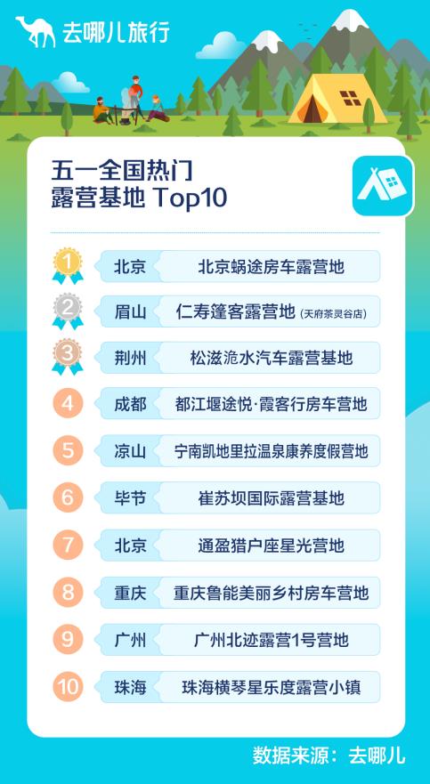 例如广州竹溪涧露营地的露营野餐套餐,在去哪儿平台上的销售量同比去年五一涨幅近5倍。成都月途露营北星营地、杭州桐洲岛露营地的组合套餐销量,同比去年涨幅近4倍。