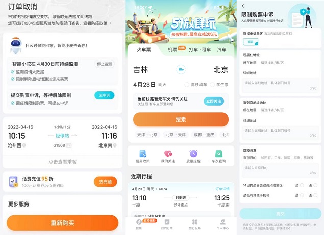 具体服务功能为,针对被大数据限制出行的用户,去哪儿可协助用户提交申诉,并自动帮助用户监控是否可以重新达到目的地,然后通过电话予以告知。针对因疫情线路停运无法出行的用户,平台会提醒用户关注线路动态,待线路通行后,会电话通知用户。
