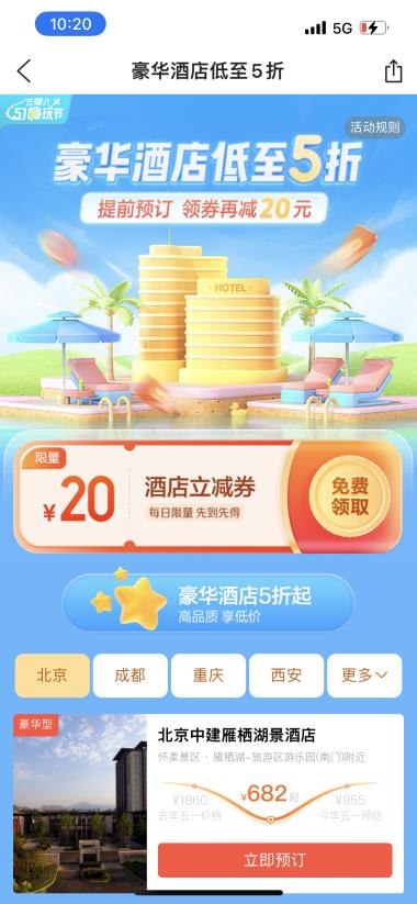 为满足本地游客的住宿需求,去哪儿推出五一本地券活动,提前预订豪华酒店,领券后可再减20元,最低折扣低至5折。北京、成都、重庆、西安、广州、杭州、三亚等城市五一部分豪华酒店价格仅需去年一半以下的价格。