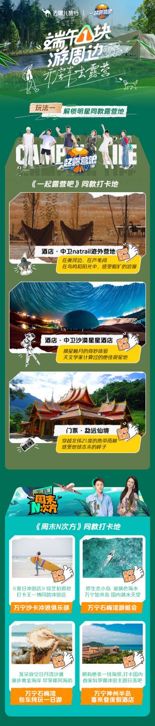 与此同时,近日去哪儿与爱奇艺户外体验真人秀《一起露营吧》达成首家OTA合作,在节目开播同期,去哪儿平台将同步上线《一起露营吧》《周末N次方》综艺同款线路和同款景区营地。另外,去哪儿将推出“端午1块游周边”活动,为用户优选平台攻略中,达人及用户种草频次高的爆款露营打卡地,提供多样选择。