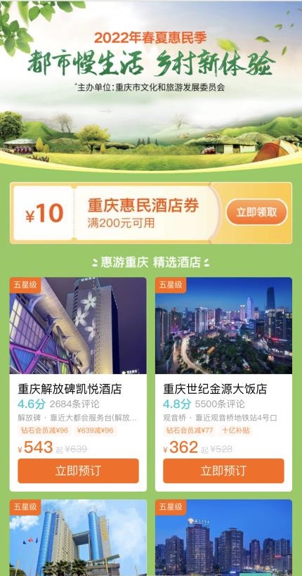 例如,去哪儿与澳门特别行政区政府旅游局合作,推出“5折住澳门”活动,目前已累计发放优惠券近20万张;与重庆文化和旅游发展委员会合作,推出“2022年春夏惠民季”,发放重庆“满200减10元惠民酒店”券,已发放逾1.5万张,重庆位列去哪儿端午酒店预订最火TOP3城市。