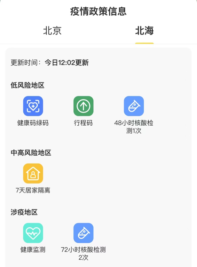 游客通过“低风险目的地指南”不仅可以一键查询国内所有常态化防控地区,还可以查看意向目的地最新防疫政策,行程码、核酸要求等信息一目了然,免去行前搜集相关信息的负担,得以便捷快速地进行旅游决策。