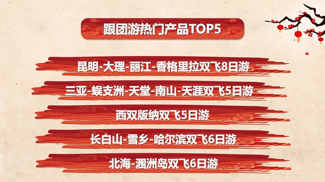 基于市场需求和用户偏好,近年来,途牛持续驱动跟团游产品朝着小团化、私家化、个性化、灵活化的方向迭代升级,为用户带来更高品质的出游体验和安全保障。今年春节假期,途牛“昆明-大理-丽江-香格里拉双飞8日游”“三亚-蜈支洲-天堂-南山-天涯双飞5日游”“西双版纳双飞5日游”“长白山-雪乡-哈尔滨双飞6日游”“北海-涠洲岛双飞6日游”等一单一团、10人精致团的跟团游产品成为用户的热门选择。
