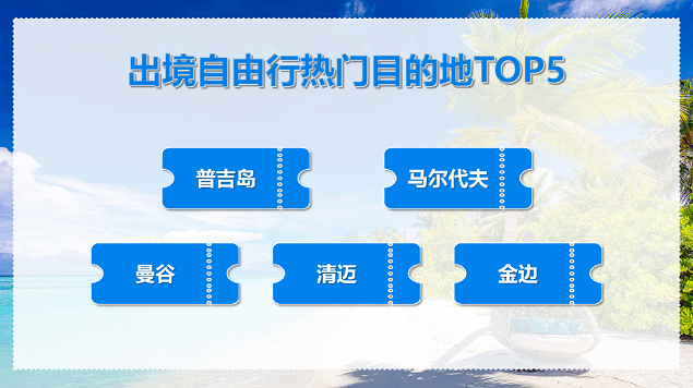 截至目前,途牛旅游网已上线近400条出境游相关的打包旅游产品,重点以“机票+酒店”“酒店+景点”等自由行以及小包团、跟团游产品为主。除中国香港、中国澳门外,目的地还覆盖泰国、马尔代夫、新加坡、印度尼西亚、马来西亚、柬埔寨、新西兰等方向,其中马尔代夫、泰国普吉岛、泰国苏梅岛目的地的产品数量排名靠前。