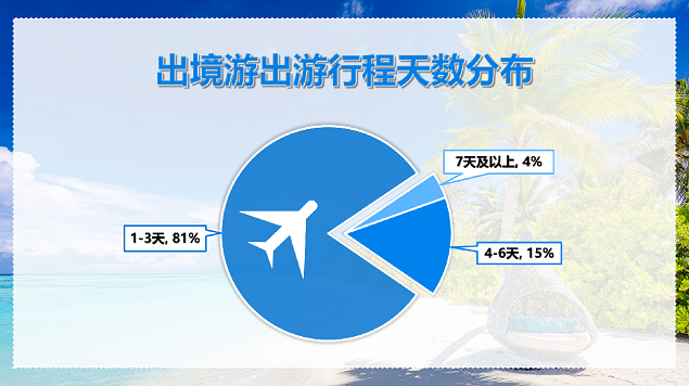 出游天数方面,大多用户选择了出境短线的旅游产品,1-3天出游行程的订单占比为81%,也有近4%的订单选择了7天及以上的出游行程,其中,预订的最长出游天数达到了16天。