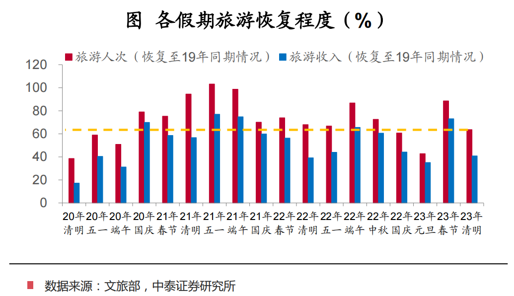 按照中泰证券的统计,今年清明日均旅游人次恢复到了2019年的63%,还不如2022年。但由于今年清明只放一天假,所以不同机构在旅游人次恢复度上的口径并不统一,比如财通证券的这个数据是71%,国信证券的数据是83%,差异还是比较大。