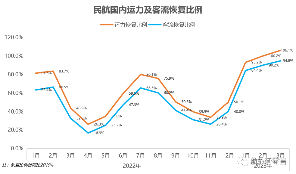 航班管家测算,2023年3月民航国内运力是2019年同期的106.1%,但国内客流量只恢复至2019年的94.8%。也就是说,3月国内民航市场整体上供大于求,且这个趋势在整个一季度都成立。由于运力过剩,部分航司已经开始搞起了促销(比如“随心飞”产品)。