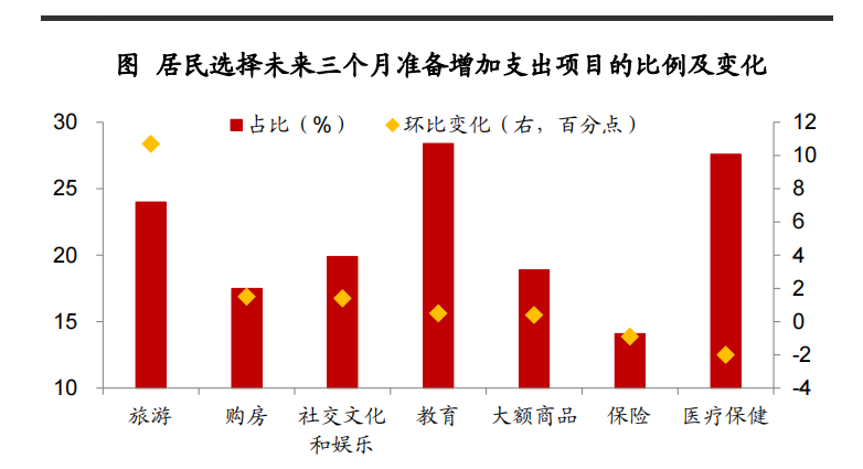 但有趣的是,旅游似乎是一个异数,从今年春节以来到现在持续蓬勃复苏——这个趋势还可能会延续到第二季度:在央行的这份报告里,在居民未来三个月计划增加支出的项目中,旅游消费跑赢了购房、社交文化和娱乐等多个选项,环比提升了近11个百分点。