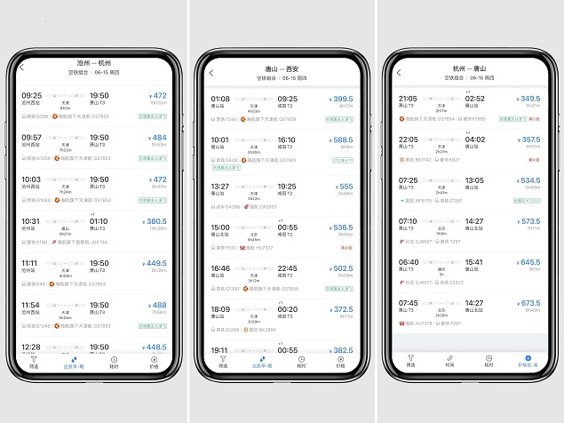携程APP展示的可经由天津中转的空铁联运线路