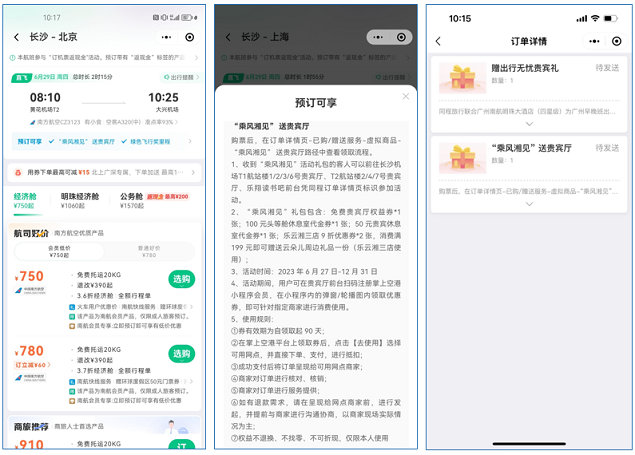 在湖南航旅消费季活动启动当天,“乘风湘见”主题活动已经在同程旅行平台上线,活动参与形式为“订票即享”。旅客通过同程旅行小程序或移动客户端等平台预订长沙黄花机场出港航班机票均可自动获赠贵宾厅权益,同时还有机会获得同程旅行平台正在发放中的其他暑期出行福利。例如,旅客当前预订长沙至上海航班,除了可参加“乘风湘见”活动自动获得长沙黄花机场的贵宾厅权益外,还可获得一张上海迪士尼门票优惠券和10元国内机票代金券,如果预订长沙飞往北京的机票则可获赠50元环球度假区门票优惠券和10元国内机票代金券。