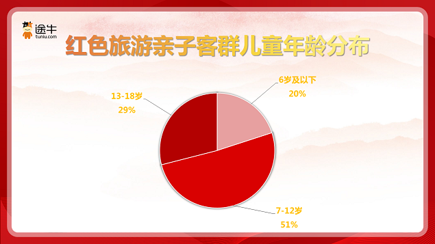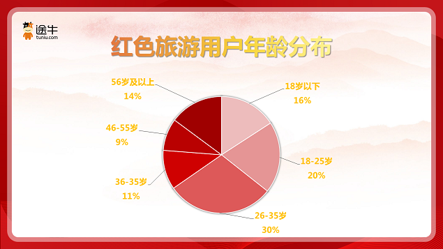 近年来,越来越多的年轻客群、亲子家庭主动参与到红色旅游中来。途牛旅游网数据显示,今年上半年参与红色旅游的用户中,年龄在26-35岁的中青年用户出游人次占比最高,达到了30%,其次是18-25岁的用户,出游人次占比为20%。从数据来看,中青年用户已成为红色旅游的消费主力。