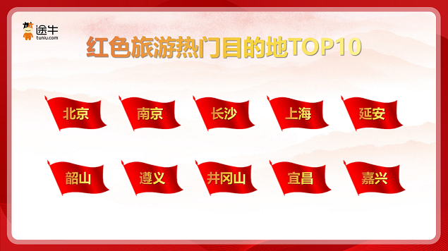 在目的地的选择上,今年上半年,北京、南京、长沙、上海、延安、韶山、遵义、井冈山、宜昌、嘉兴等地是更受途牛用户更喜爱的红色旅游目的地。以北京为例,今年以来,天安门广场、中国国家博物馆、中国人民革命军事博物馆等红色旅游景区热度一直居高不下,打卡天安门广场、观看升旗仪式几乎成为游客去北京游玩的标配。中国国家博物馆同样是异常火热,即便是日常工作日,门票也是经常预约“全满”,周末及假节日更是一票难求。