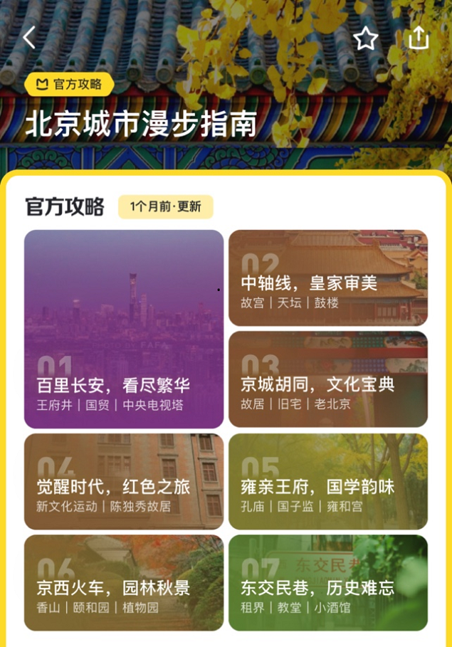 事实上,Citywalk并不是什么新鲜概念,作为一种深度探索城市、了解当地人文历史的旅行方式,其在今年爆火出圈以前,就已经是马蜂窝玩家们乐此不疲的玩法了。马蜂窝权威攻略品牌“北极星攻略”专为多座人文旅行资源丰富的城市打造的“城市漫游攻略”,是众多年轻人赴当地旅行之前的必读宝典。