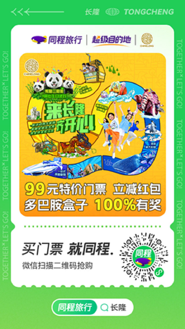 与长隆旅游度假区合作期间,用户在同程旅行小程序、APP景区页面“开多巴胺盒子”,有机会99元购买长隆旅游度假区门票,或领取广州和珠海长隆旅游度假区通用红包。同步推出的还有长隆欢乐世界、动物世界、水上乐园、海洋王国、飞鸟乐园,以及广州和珠海长隆大马戏演出等多项优惠促销。除了小程序和APP,同程旅行也将通过视频号直播形式为视频用户上线长隆优惠产品。