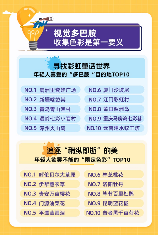 年轻人对“多巴胺”的偏爱已经从穿搭蔓延到旅行。对于越来越多的年轻人来说,旅行不是目的,在旅途中获得快乐才是意义。沿途收集五彩缤纷的美景、为演唱会或赛事赴一座城、邂逅博物馆里的“显眼包”们,都可以成就一段完美的“多巴胺”旅行。