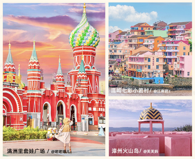 今年蹿红于社交平台的“多巴胺穿搭”已被不少先锋玩家们运用到了旅行中,色彩与建筑的奇妙组合,迅速在年轻人中掀起一股寻觅“多巴胺”景点的打卡潮。童话城堡般的满洲里套娃广场凭借绚丽的色彩和异域风情十足的建筑风格,在年轻人喜爱的“多巴胺”目的地榜单中拔得头筹,“蓝色小镇”新疆喀赞其和“中国版五渔村”青岛青山渔村紧随其后。