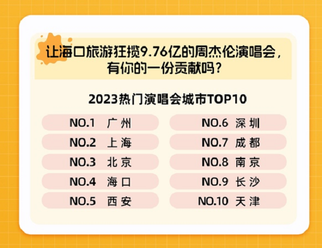 蓬勃发展的演唱会为目的地旅游带来不可估量的经济效益,超过三十位明星前来举办演唱会,助力广州登上热门演唱会城市榜首。周杰伦演唱会帮海口狂揽9.76亿,不仅达到海口端午假期旅游收入的3倍,甚至比五一小长假的旅游收入高出1亿。