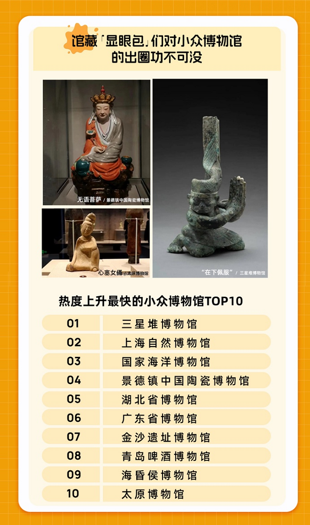 不久前刚开放新馆的三星堆博物馆在热度上升最快的小众博物馆榜单中荣登榜首,即使曾经去过,也有不少年轻人愿意为了新馆二刷甚至三刷。 “无语菩萨”则以表情包届的“顶流”身份横空出世,让景德镇中国陶瓷博物馆一举冲入前五。