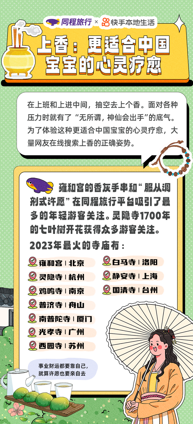 各类寺庙成为年轻人的“心头好”,更是被网友评为“更适合中国宝宝的心灵疗愈”。每逢节假日,很多年轻人选择前往寺庙景区,缓解生活和工作中的焦虑。寺庙类景区面向年轻人进行了产品创新,推出祝福卡、明信片、手串等各类年轻人喜爱的文创产品,部分寺庙还推出了主题咖啡、“随缘”盲盒等,吸引年轻游客关注。