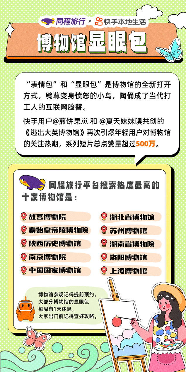 随着文化和旅游的深度融合,各地博物馆成为人们了解中国历史文化和各地文化风俗的重要场景。博物馆文物的表情包,也在社交媒体上广受欢迎。同程旅行数据显示,故宫博物院、秦始皇帝陵博物院、陕西历史博物馆等是中秋国庆假期较热门的国内博物馆。今年8月,同程旅行联合洛阳博物馆推出《洛水时裳——汉服雅集》和《时裳武则天》主题展览等系列活动,受到用户关注,洛阳博物馆也进入榜单前十。