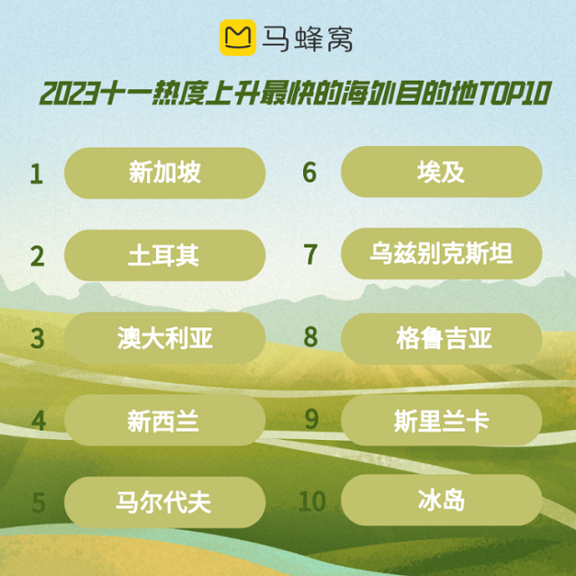 利用难得的长假来一次海外旅行,也是众多年轻人和家庭出行游客的选择。土耳其以225%的热度涨幅成为最受欢迎的海外长线目的地,仅次于新加坡,在十一假期热度上升最快的海外目的地榜单上位居次席。“土耳其自驾攻略”、“土耳其酒店选择”、“土耳其美食”是马蜂窝北极星攻略社群中咨询最多的问题。