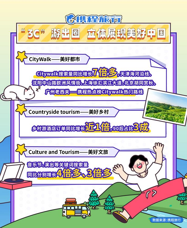 “十一”假期,秋色迷人、气候宜人,适合出游,是许多人饱览祖国山河、发现美好中国的最佳时机。今年“十一”,以都市游(Citywalk)、乡村游(Countryside tourism)、文旅融合(Integration of Culture and Tourism)为代表的“3C”旅游,成为游客发现美好中国的三个侧面。