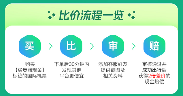为进一步提升用户出境游服务体验,用户通过同程旅行预订和购买含【买贵赔现金】标签的国际机票,在同一时间同一航班如若遇到其他平台更低价格,同程旅行将对高出的票价进行2倍补偿(单笔赔付上限500元),以保障同程旅行会员享有的权益。