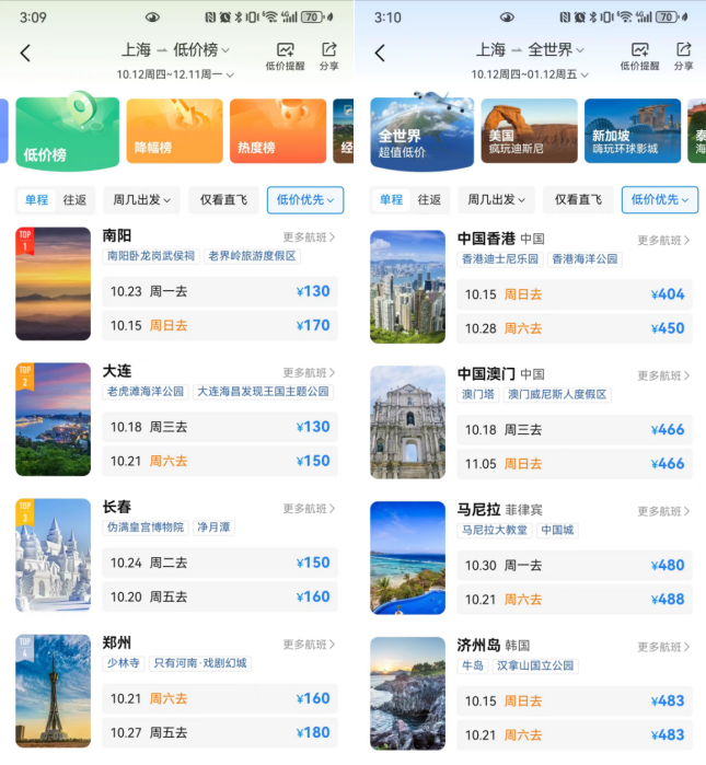 假日过后机票大幅跳水降价,携程数据显示,截至10月11日,国庆后至10月底的国内机票含税均价为702元,较国庆期间国内机票均价1028元下降46%。在携程机票低价榜可以看到许多近期一两百元的特价机票:例如10月21日、10月28日上海去青岛的机票198元起;10月14日上海去海口有255元的机票;10月17日北京去西安的机票220元起;10月17日深圳去杭州的机票200元起。