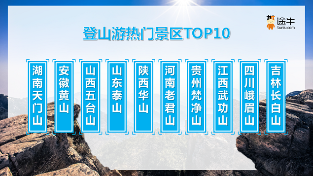 我国的名山高峰不胜枚举,雄、险、奇、灵、秀各具特色。数据显示,在众多登山游景区中,湖南天门山、安徽黄山、山西五台山、山东泰山、陕西华山、河南老君山、贵州梵净山、江西武功山、四川峨眉山、吉林长白山等是途牛用户更为热门的选择。