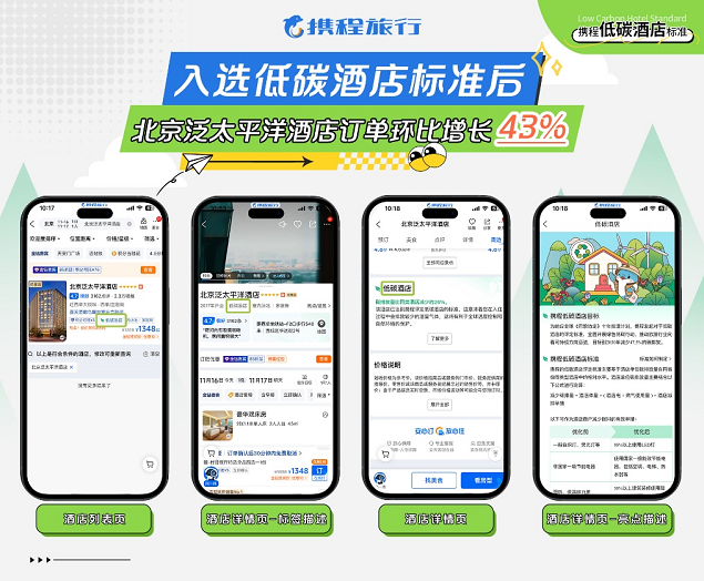 近一周,携程平台上低碳酒店认证咨询量增长近6倍。商家在获得认证之后,清晰明了的“低碳酒店”标签拉高了用户点击,订单量也在稳步提升,首批入选该标准的酒店已获红利。以“北京泛太平洋酒店”为例,入选携程低碳酒店后,曝光量增长,带动订单量环比提升43%。