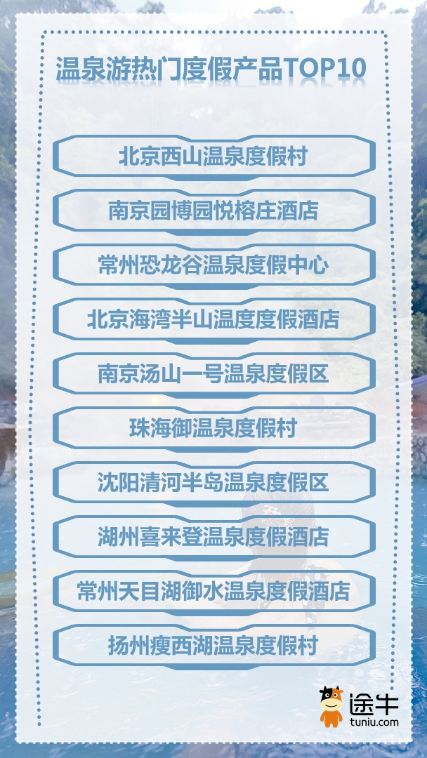 在温泉度假地的选择上,用户更加注重自然环境、文化氛围和舒适度等方面的综合体验。尤其是景区的拥挤度、温泉水质、配套设施、服务质量、儿童体验等,均是他们关注的焦点。在此类需求影响下,近年来,温泉主题酒店、温泉度假村、温泉主题乐园等一站式微度假产品热度持续走高。途牛11月预订数据显示,北京西山温泉度假村、南京园博园悦榕庄酒店、常州恐龙谷温泉度假中心、北京海湾半山温泉度假酒店、南京汤山一号温泉度假区、珠海御温泉度假村、沈阳清河半岛温泉度假区、湖州喜来登温泉度假酒店、常州天目湖御水温泉度假酒店、扬州瘦西湖温泉度假村等预订热度排名靠前。