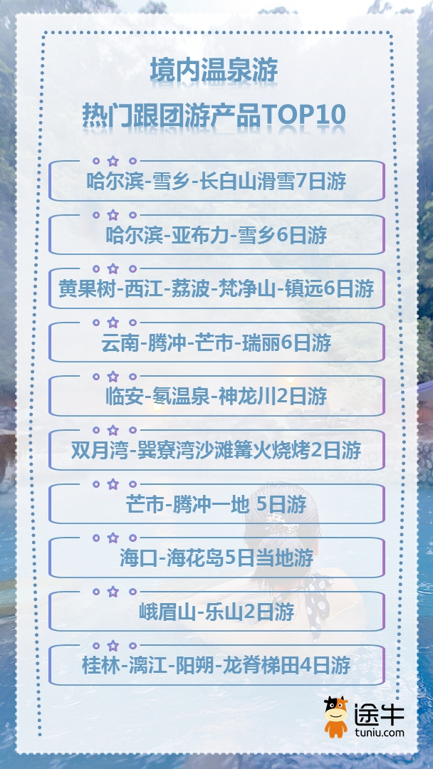 为进一步满足用户高品质、多元化、个性化的温泉游需求,途牛在跟团游产品设计中充分结合用户喜好和目的地优势资源,在行程中加入了温泉度假区、温泉主题酒店等,丰富用户出游体验的同时,缓解旅途疲劳,以更好的状态迎接接下来的旅行。如牛人专线“黄果树-西江-荔波-梵净山-镇远6日游”产品,自今年11月下旬起加入了拥有400多年历史的石阡温泉,该温泉是全球为数不多的既能洗浴又能直接饮用的天然矿泉温泉,非常适合用户对温泉干净卫生、人文结合、独特体验的需求。再如“双月湾-巽寮湾沙滩篝火烧烤2日游”产品,在打卡网红双月湾大星山观景台,体验出海捕鱼、烟花篝火晚会、BBQ烧烤、沙滩运动的同时,还能前往以海洋文化为主题的海滨温泉乐园,体验大海龟、海豚、海马、海龙等富有海洋文化特色的各类温泉池,是家庭周末出游或企业团建的热门选择。