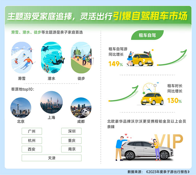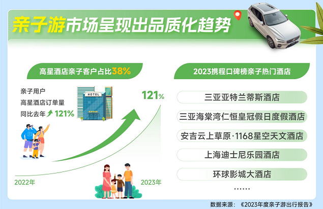 2023年,亲子游市场迎来强势复苏,在需求的爆发式增长下,消费者也表现出新的行为特征和消费趋势。1月11日,携程联合沃尔沃XC60联合发布《2023年度亲子游出行报告》,数据显示:亲子游消费在2023年表现出高速增长态势,80后、90后父母成亲子游消费主力;在景区的门票订单中,亲子门票同比去年增长两倍;亲子游用户订购滑雪、潜水、徒步等主题游的占比高达33%;租车自驾游同比增长149%,订购高星酒店的用户中,亲子用户占比为38%,亲子用户订购量同比去年增长121%;私家团产品的亲子客户占比55%,订购私家团的亲子用户订单量同比去年增长403%。
